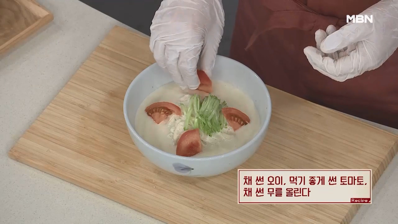 11. 채썬 오이와 먹기 좋게 썬 토마토, 채썬 무 고명을 올려주면 콩국수가 완성됩니다.
