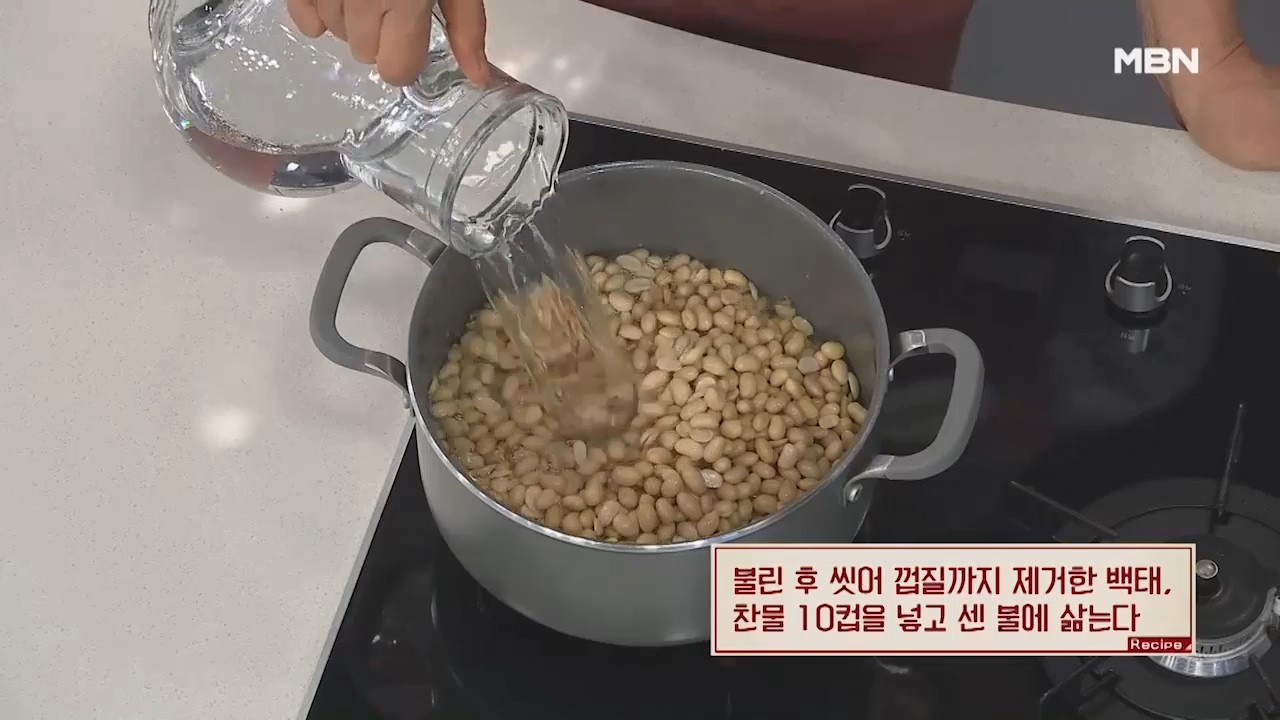 2. 백태를 불린 후 씻어 껍질까지 제거하고 찬물 10컵을 넣고 센불에 삶아줍니다.