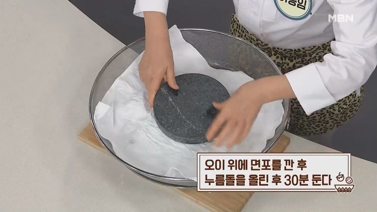 8. 오이 위에 면포를 깐 후 누름돌을 올린 후 30분 둡니다.