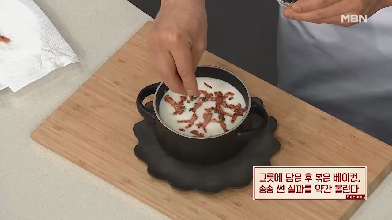9. 감자스프를 그릇에 담은 후 볶은 베이컨과 송송 썬 실파를 약간 올리면 맛있는 감자스프가 완성됩니다.