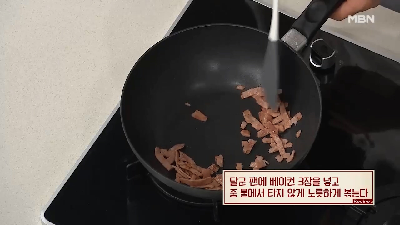 1. 달군 팬에 베이컨 3장을 잘라 넣고 중 불에서 타지 않게 노릇노릇하게 볶아줍니다.