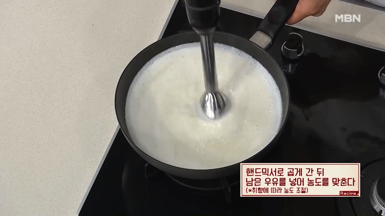 6. 핸드믹서로 곱게 간 뒤 남은 우유를 넣어 농도를 맞춥니다.