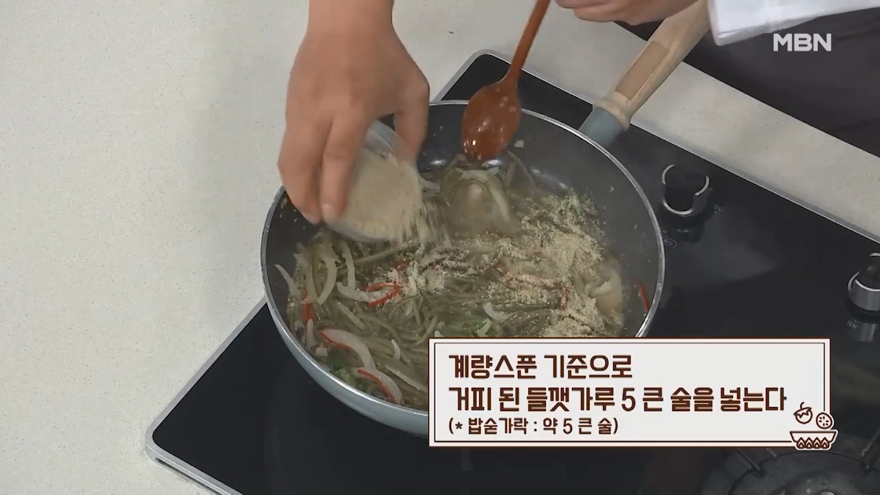 11. 계량스푼 기준으로 거피 된 들깻가루 6큰술을 넣으면 고구마순볶음이 완성됩니다.