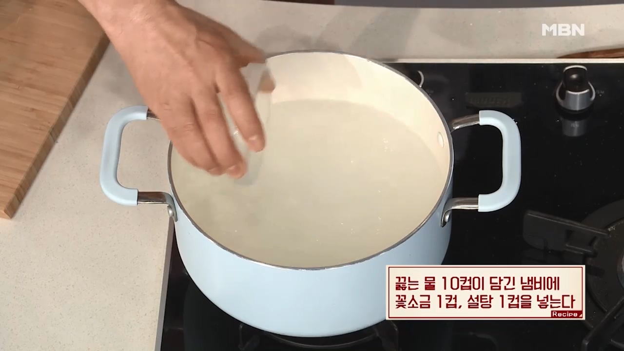 4. 끓는물 10컵이 담긴 냄비에 꽃소금 1컵, 설탕 1컵을 넣어줍니다.