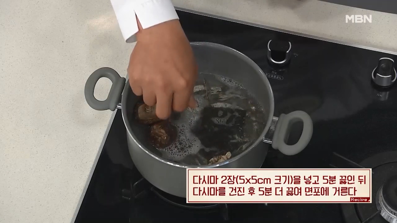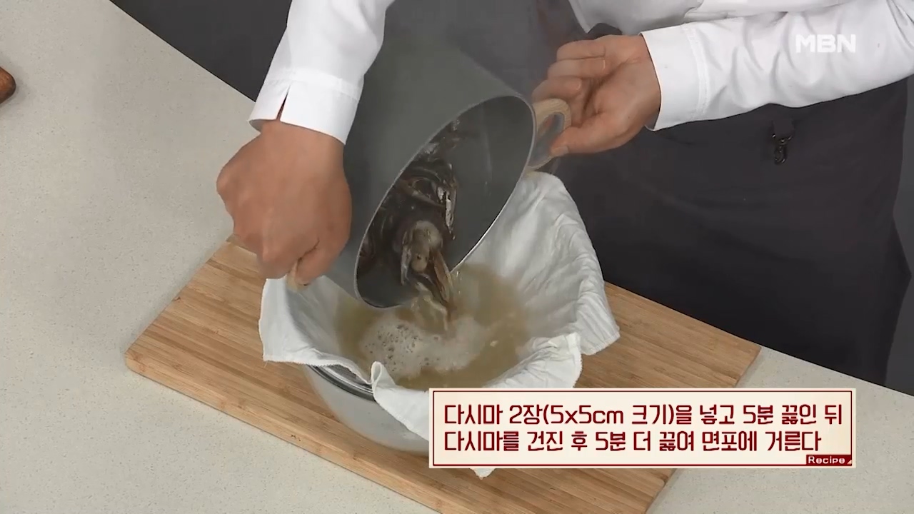 7. 다시마 2장(5cm x 5cm 크기)을 넣고 5분 끓인 뒤 다시마를 건진 후 5분 더 끓여 면포에 거릅니다.