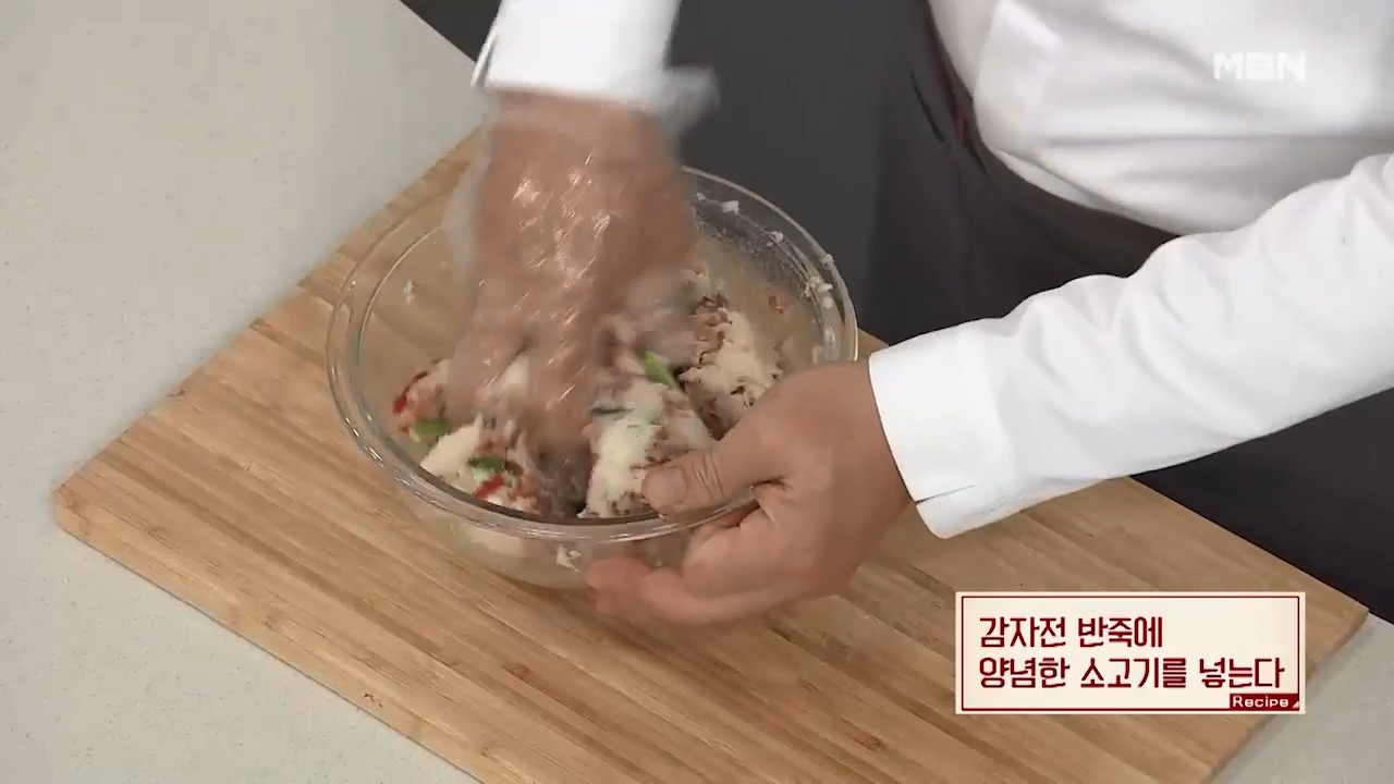 7. 감자전 반죽에 양념한 소고기를 넣어 잘 섞어줍니다.