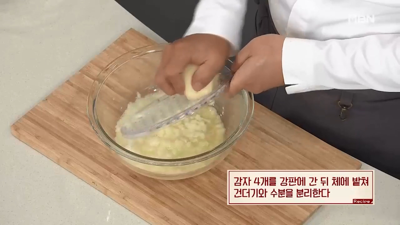 1. 감자 4개를 강푼에 간 뒤 체에 밭쳐 건더기와 수분을 분리해줍니다.