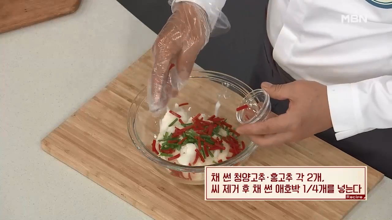4. 채 썬 청양고추와 홍고추 각 2개, 씨 제거 후 채 썬 애호박 1/4개를 넣어줍니다.