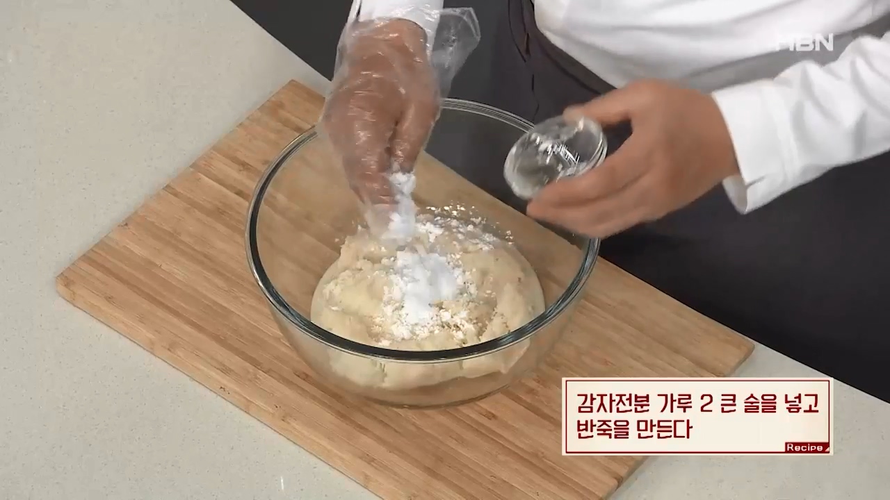 4. 감자전분 가루 2큰술을 넣고 감자옹심이 반죽을 만듭니다.