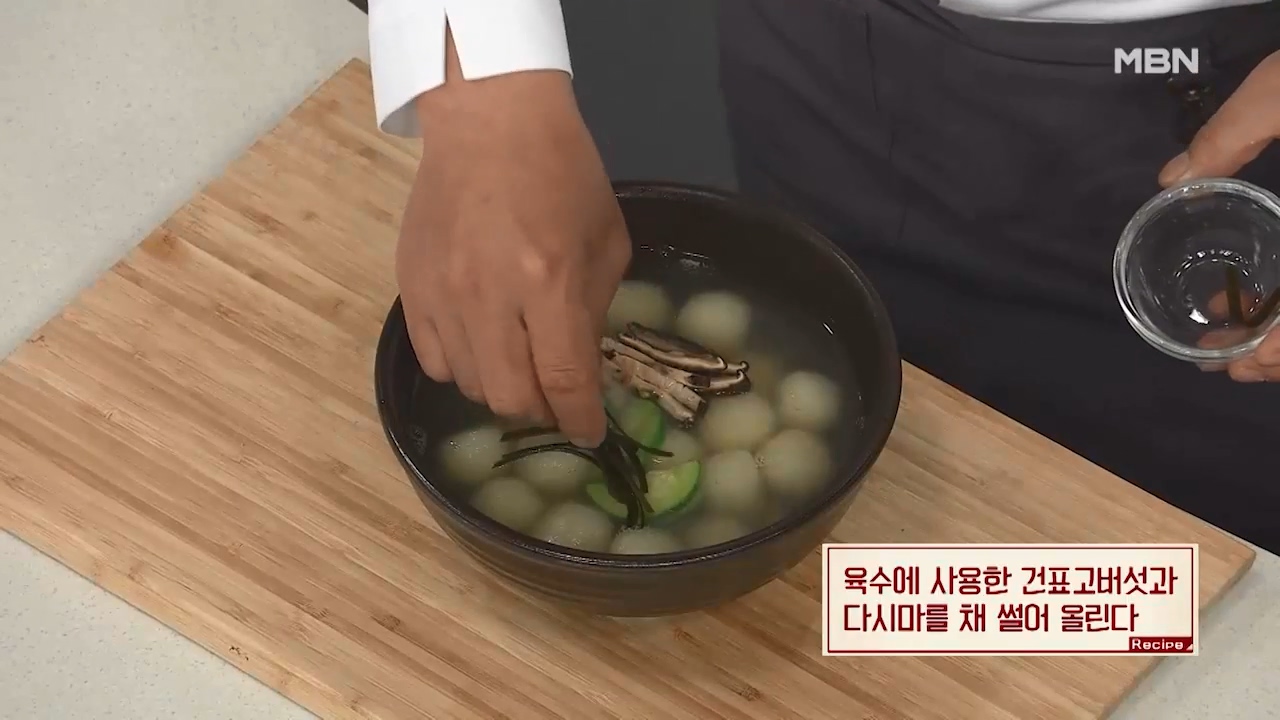 10. 육수에 사용한 건표고버섯과 다시마를 채 썰어 올리면 감자옹심이 만들기가 완성됩니다.