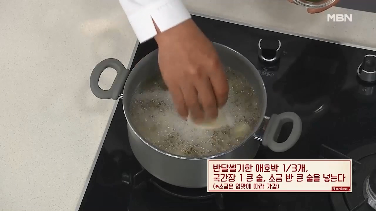 9. 반달썰기한 애호박 1/3개, 국간장 1큰술, 소금 반큰술을 넣어줍니다.