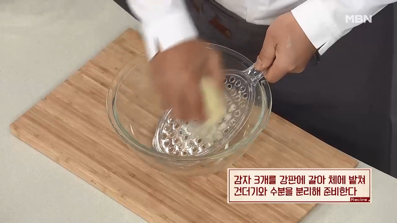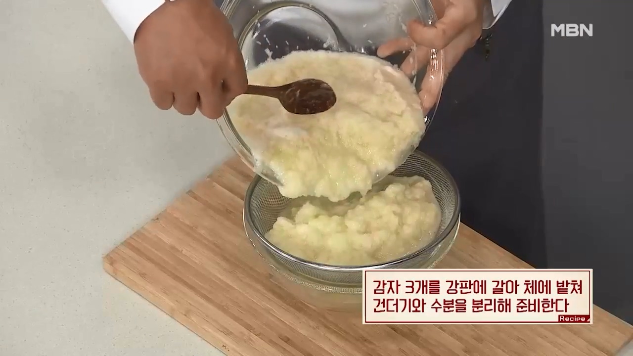 1. 감자 3개를 강판에 갈아 체에 밭쳐 건더기와 수분을 분리해 준비합니다.
