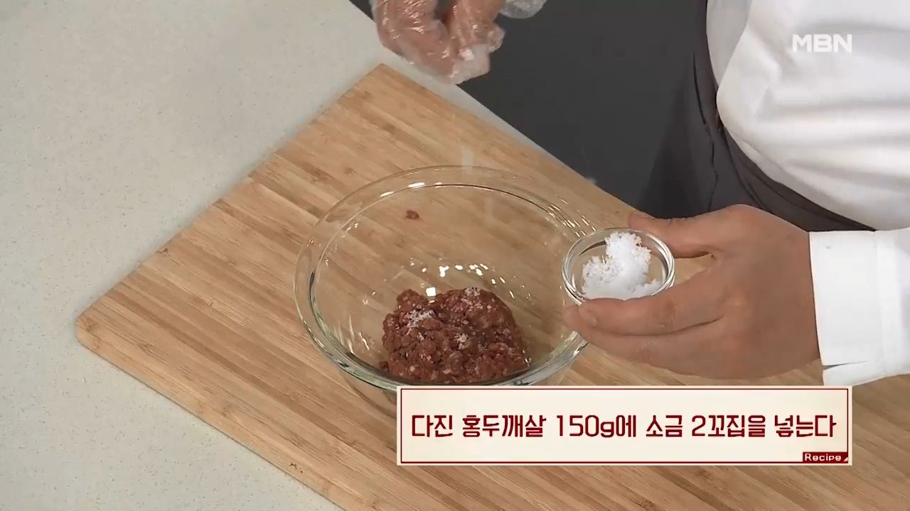 5. 다진 홍두깨살 150g에 소금 2꼬집을 넣어줍니다.