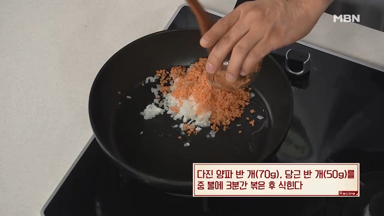 1. 다진 양파 반개(70g), 당근 반개(50g)를 중 불에 3분간 볶은 후 식혀줍니다.
