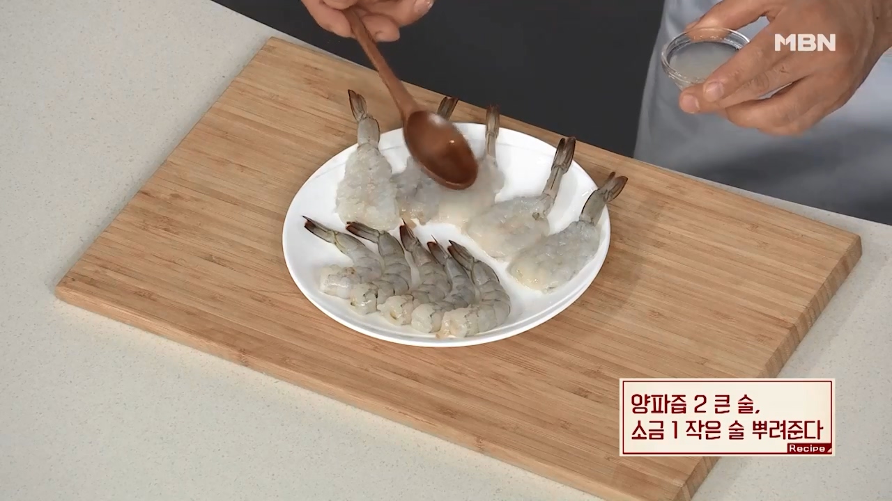 3. 양파즙 2큰술, 소금 1작은술을 새우에 뿌려줍니다.