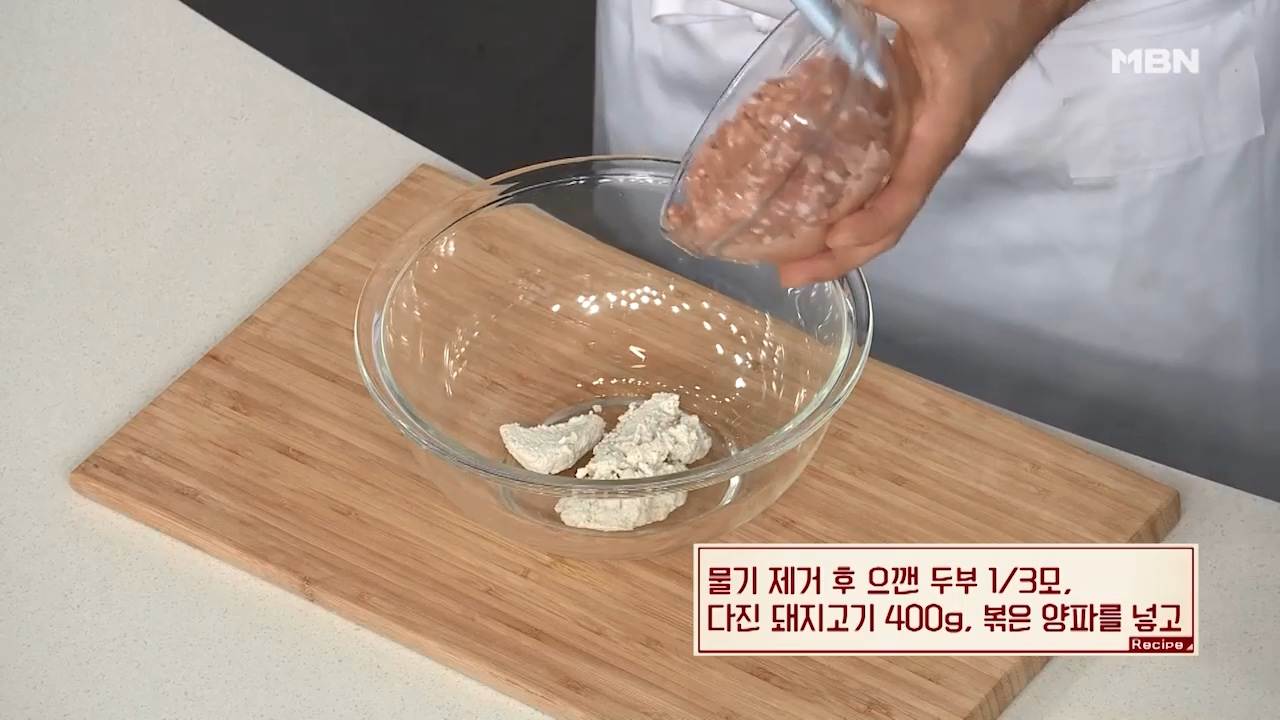 2. 두부 1/3모를 물기를 자거하고 으깨고 다진 돼지고기 400g, 볶은 양파와당근을 넣어줍니다.