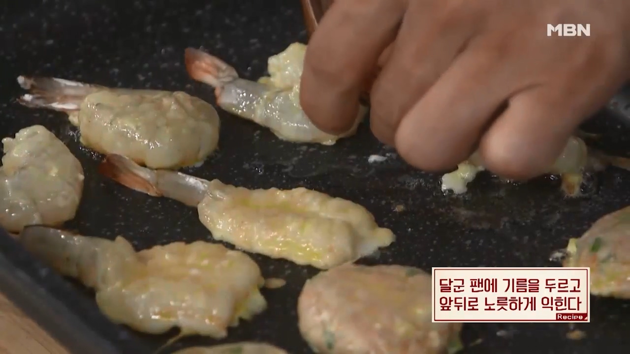 6. 달군 팬에 기름을 두르고 앞뒤로 노릇하게 익혀주면 맛있는 새우전을 맛볼수 있습니다.