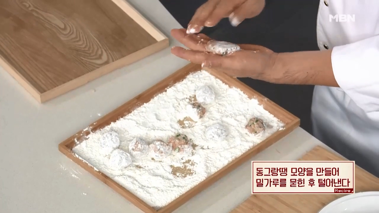 6. 동그랑땡 모양을 만들어 밀가루를 묻힌 후 털어냅니다.