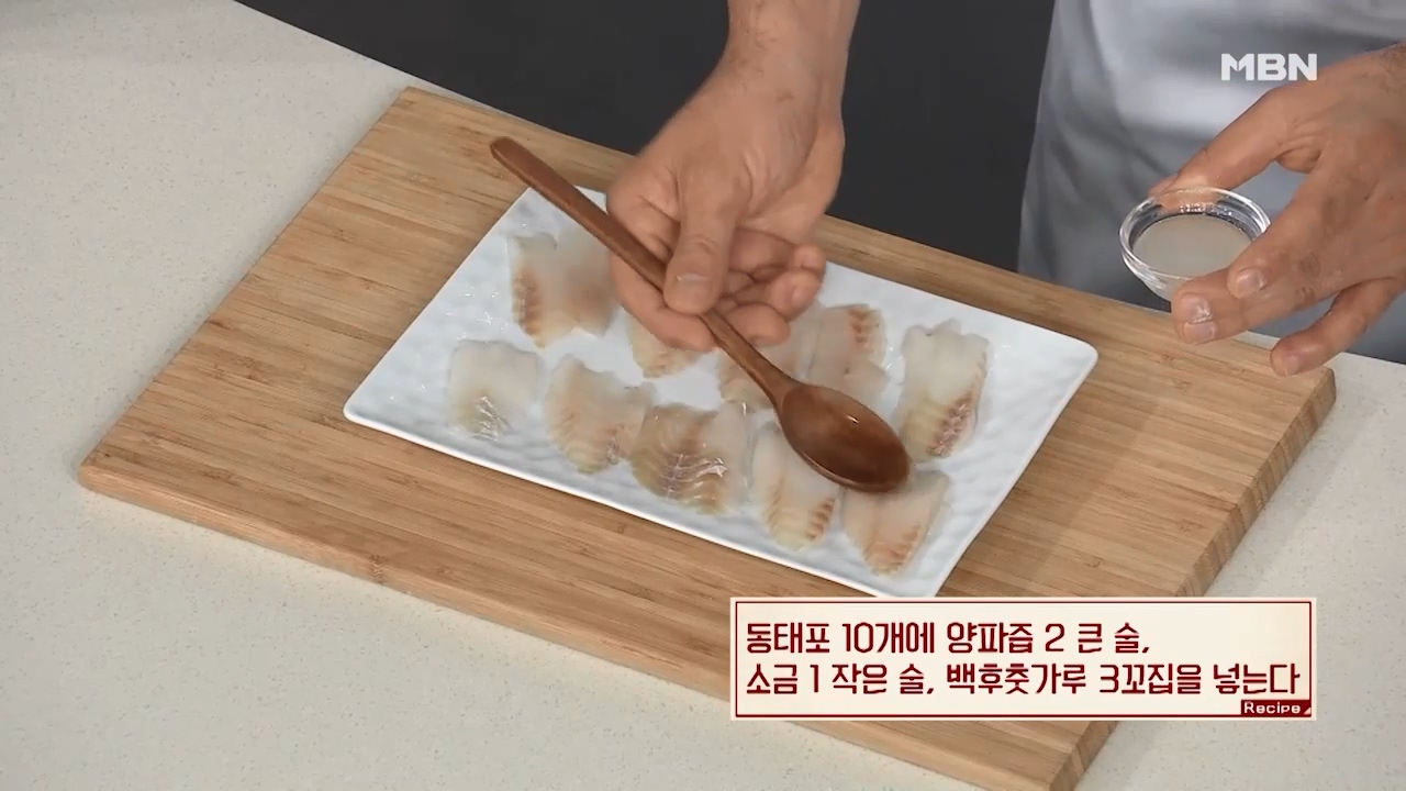 1. 동태포 10개에 양파즙 2큰술, 소금 1작은술, 백후춧가루 3꼬집을 묻혀 밑간을 합니다.