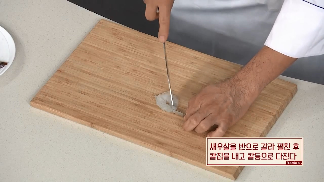 2. 새우살을 반으로 갈라 펼친 후 칼집을 내고 칼등으로 다져줍니다.