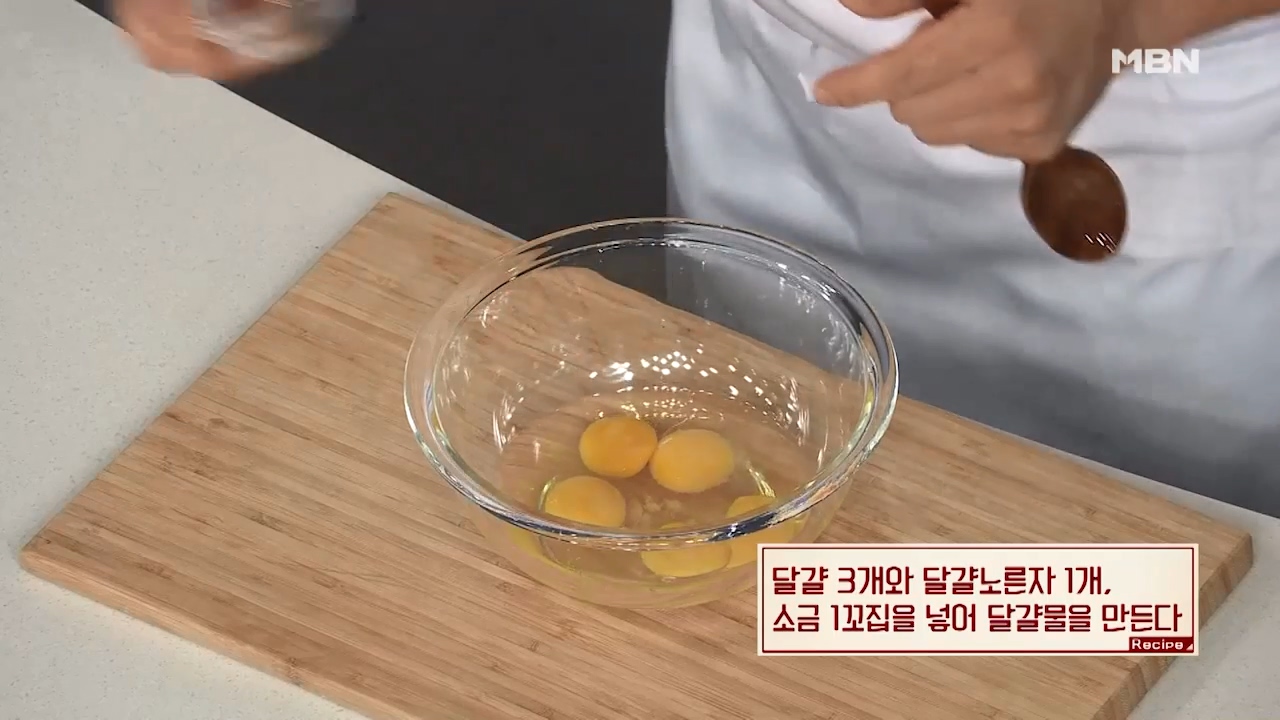 7. 달걀 3개와 달걀 노른자 1개, 소금 1꼬집을 넣어 달걀물을 만들어 줍니다.