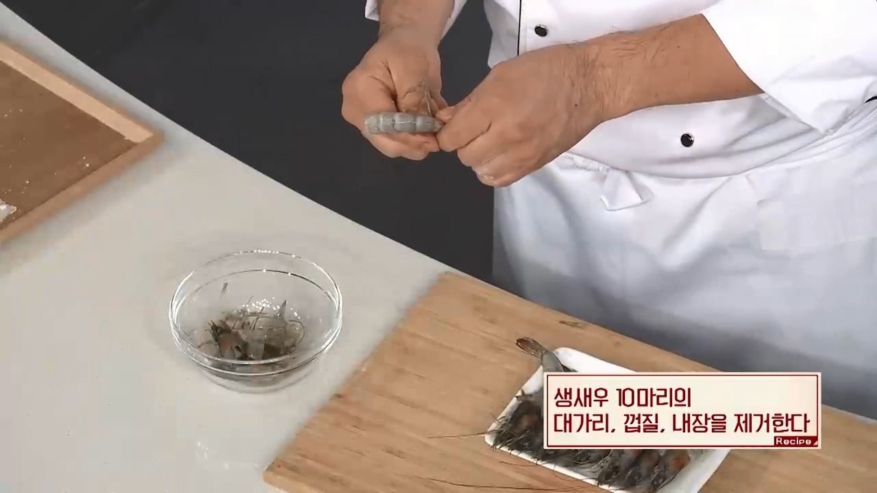 1. 생새우 10마리의 대가리, 껍질, 내장을 제거해 줍니다.