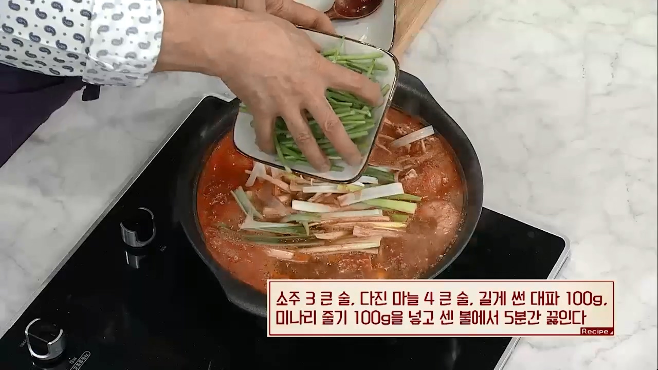 14. 소주 3큰술, 다진마늘 4큰술, 길게 썬 대파 100g, 미나리 줄기 100g을 넣고 센불에서 5분간 끓여줍니다.