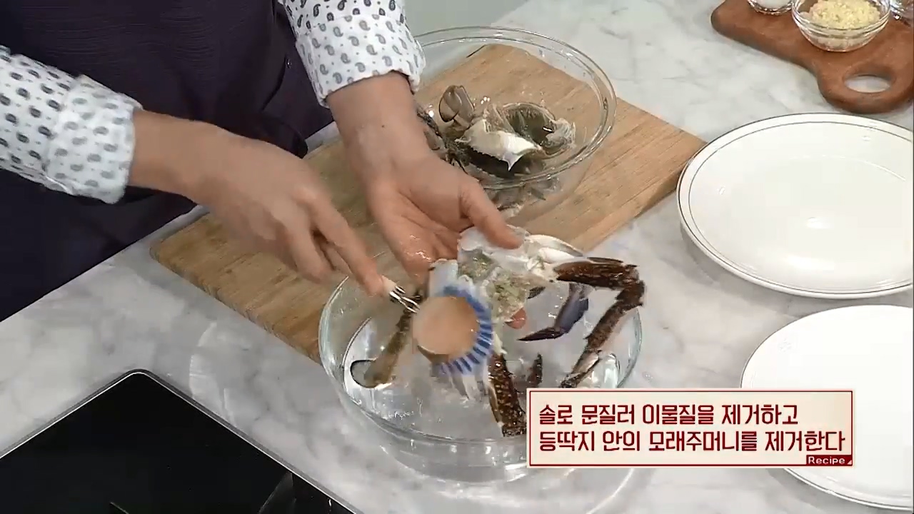 1. 꽃게의 배와 등딱지, 횡격막 주머니, 더듬이를 제거합니다.