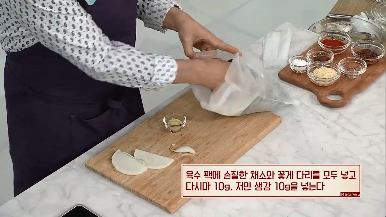 8. 육수 팩에 손질한 채소와 꽃게 다리를 모두 넣고 다시마 10g 저민 생강 10g을 넣어줍니다.