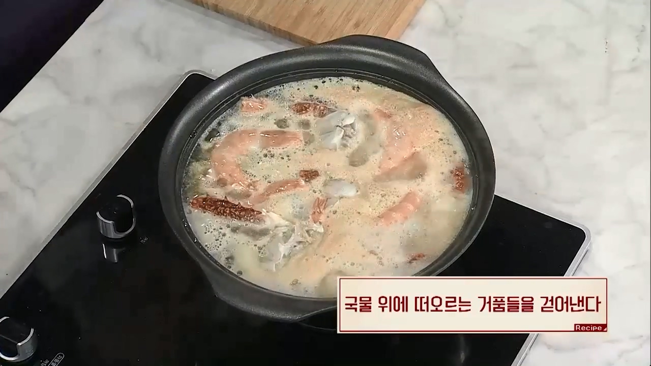 12. 국물 위에 떠오르는 거품들을 걷어냅니다.