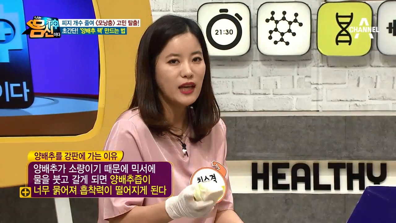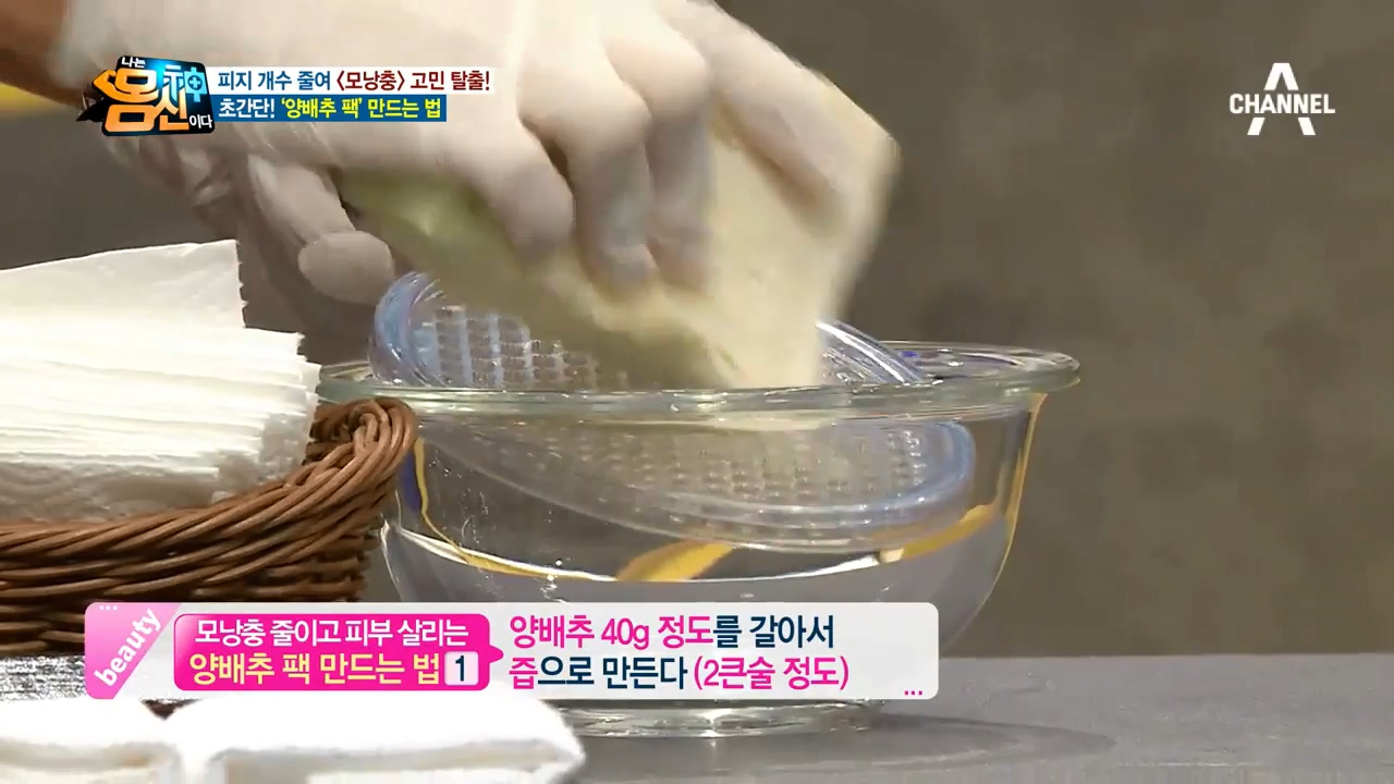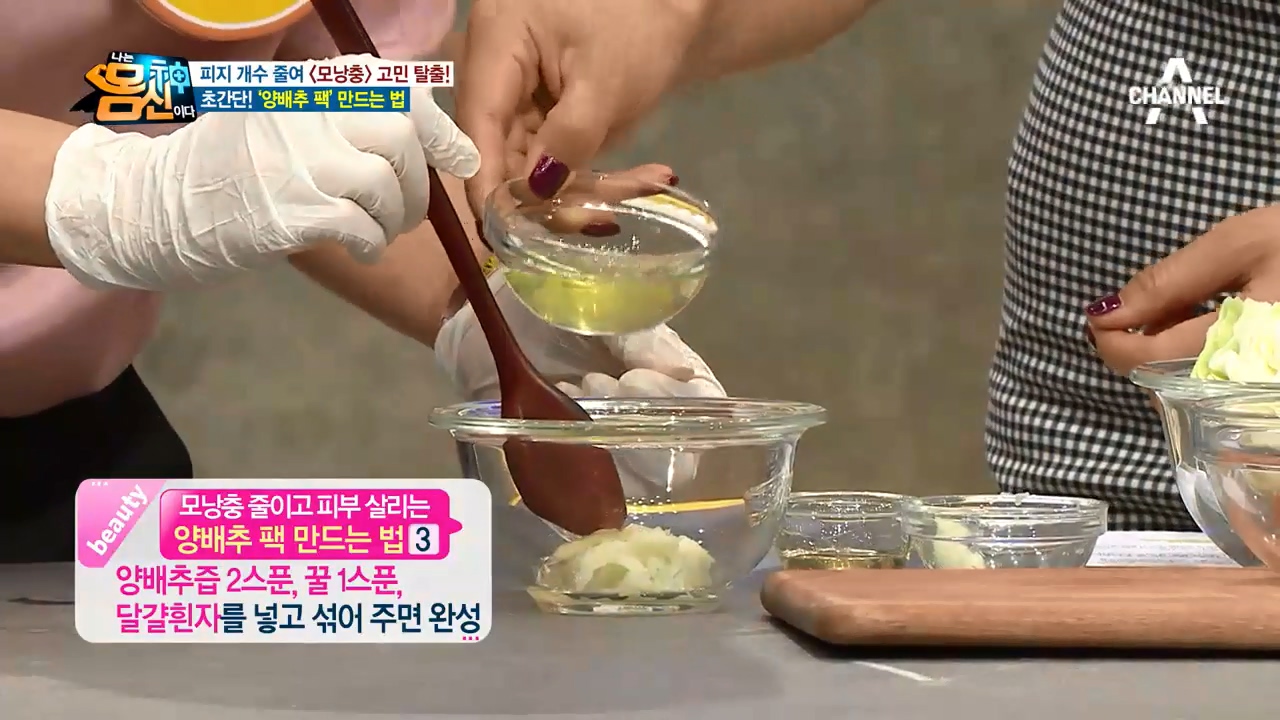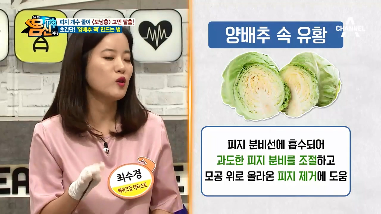 모낭충이 피부에 있으면 피부를 자극해 피부가 예민해지고 붉어지는등 다양한 피부트러블을 일으킨다고 합니다. 나는몸신이다에서는 모낭충을 줄이고 피지 제거에도 좋은 양배추팩 만드는법을 알려줬는데요. 양배추에는 유황 성분이 있어 피지 분비선에 유황 성분이 흡수되어 과도한 피지 분비를 조절하고 모공 위로 올라온 피지 제거에 도움을 준다고 합니다.