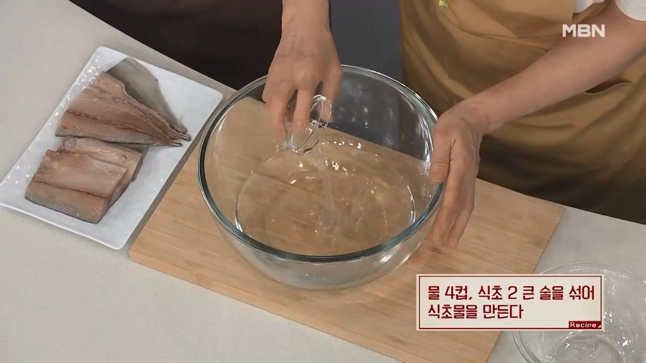 3. 고등어를 먹기 좋게 자른 후 식초물에 5분간 담급니다.