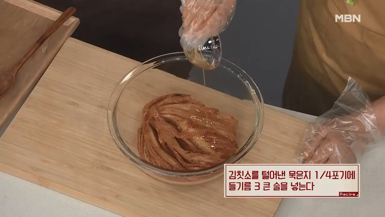 7. 김칫소를 털어낸 묵은지 1/4포기에 들기름 3큰술을 넣어줍니다.