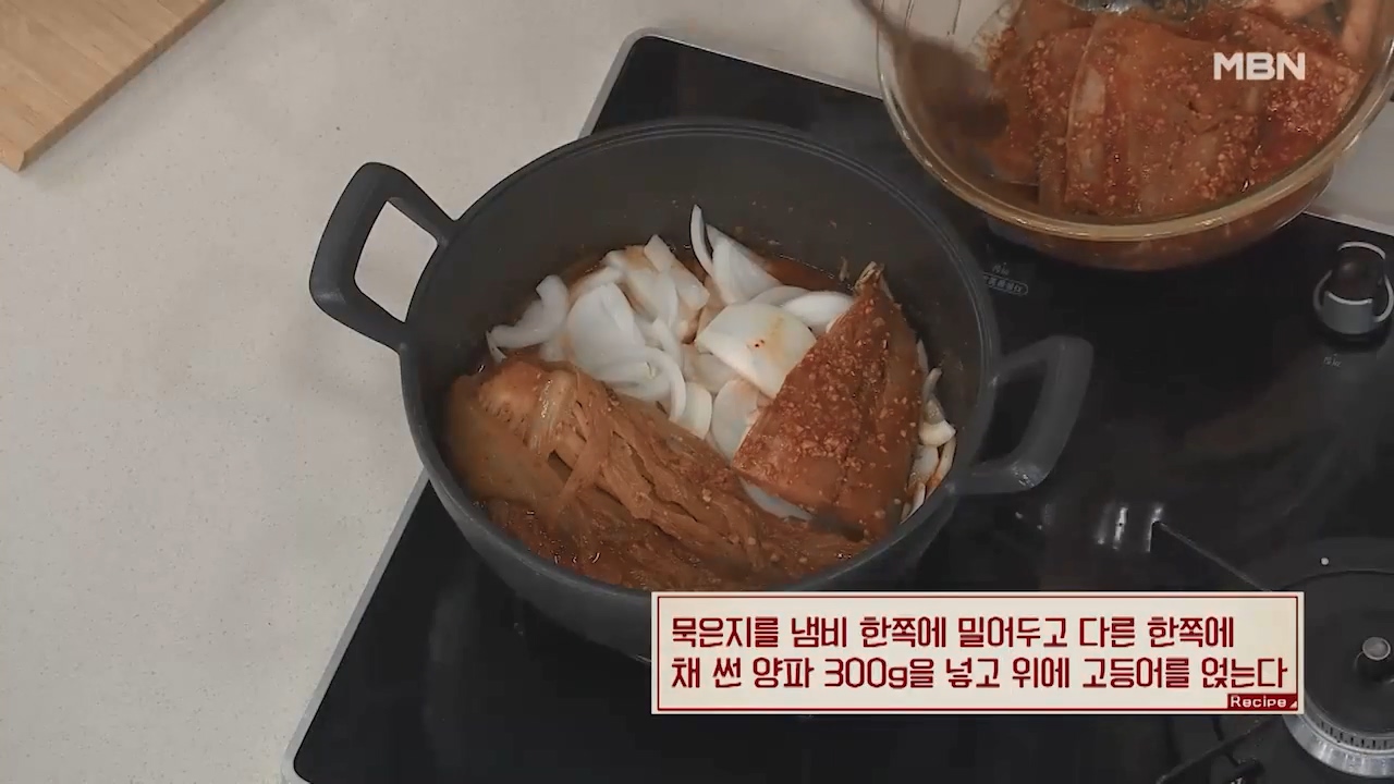 11. 묵은지를 냄비 한쪽에 밀어두고 다른 한쪽에 채 썬 양파 300g을 넣고 위에 고등어를 얹어줍니다.