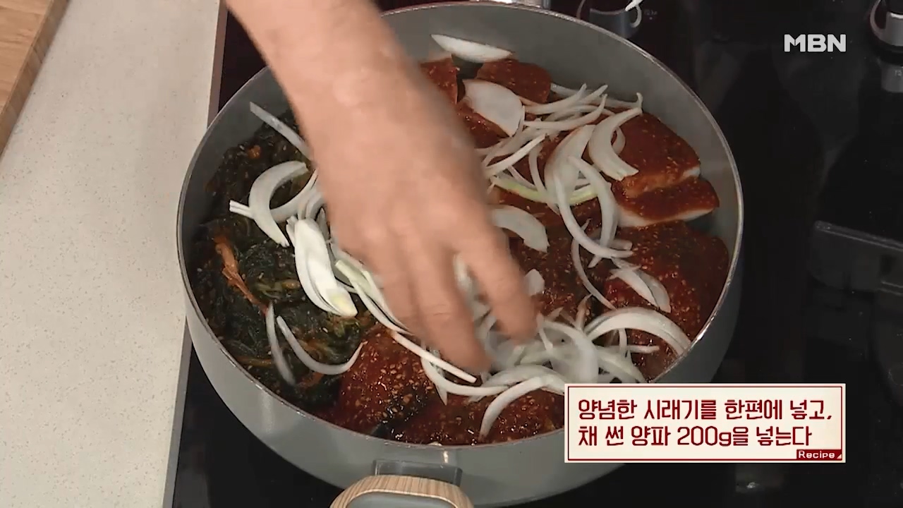 13. 양념한 시래기를 한편에 넣고 채 썬 양파 200g을 넣습니다.