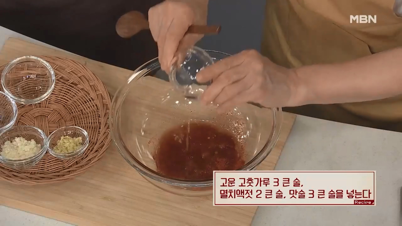 4. 고운 고춧가루 3큰술, 멸치액젓 2큰술, 맛술 3큰술을 넣습니다.