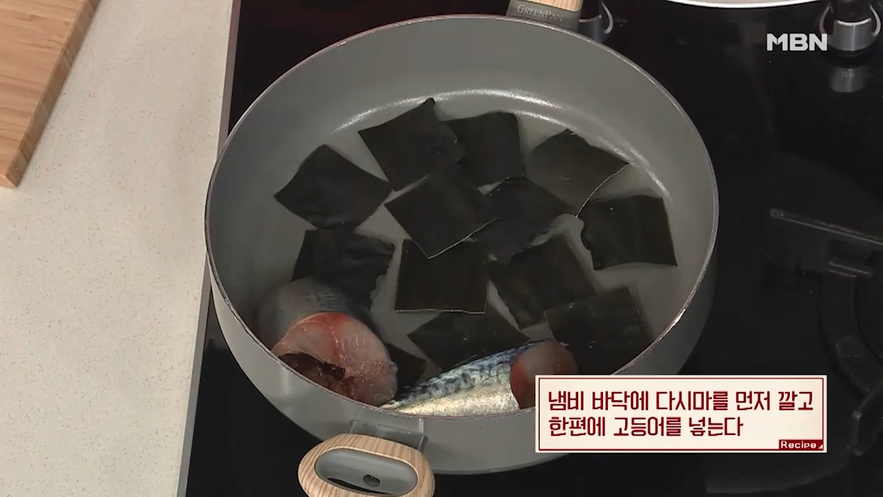 9. 냄비 바닥에 다시마를 먼저 깔고 한편에 고등어를 넣습니다.