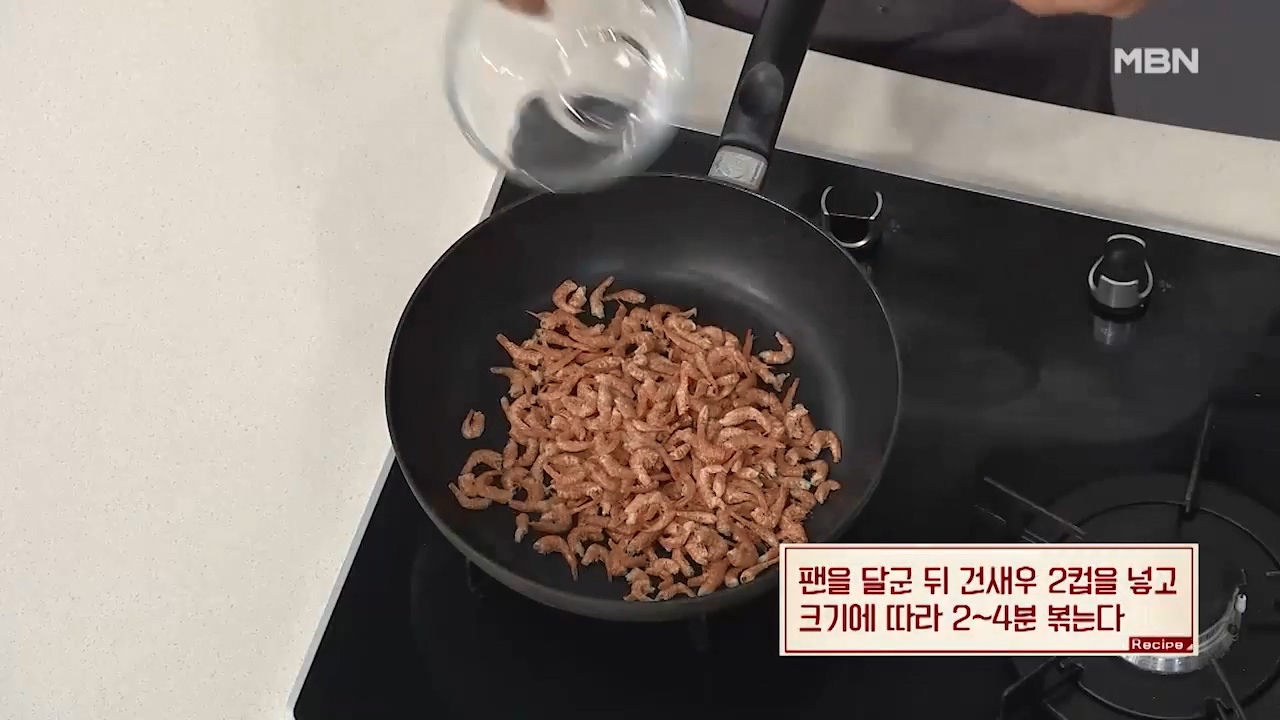 1. 팬을 달군 뒤 건새우 2컵을 넣고 크기에 따라 2~4분 볶아줍니다.