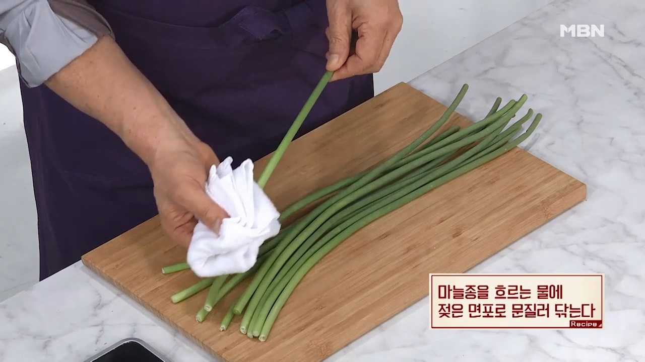 3. 마늘종을 흐르는 물에 젖은 면포로 문질러 닦아줍니다.