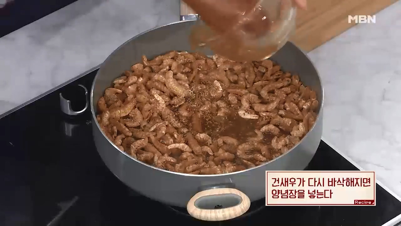 10. 건새우가 다시 바삭해지면 양념장을 넣어줍니다.