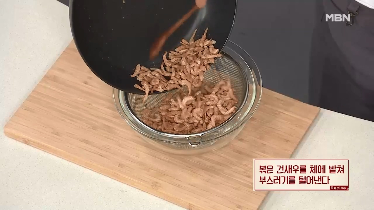 2. 볶은 건새우를 체에 밭쳐 부스러기를 털어냅니다.
