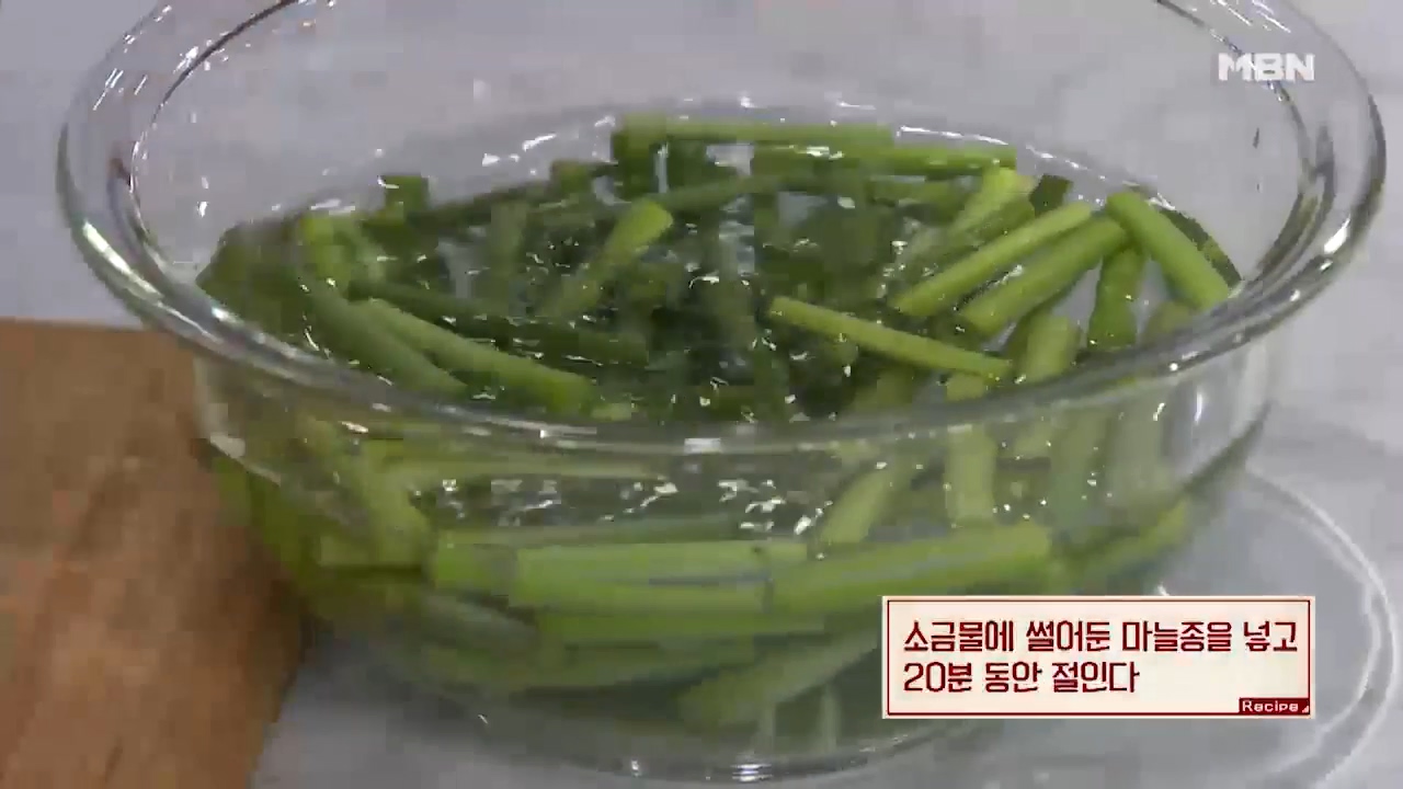 6. 소금물에 썰어둔 마늘종을 넣고 20분 동안 절여줍니다.