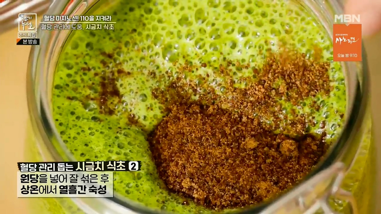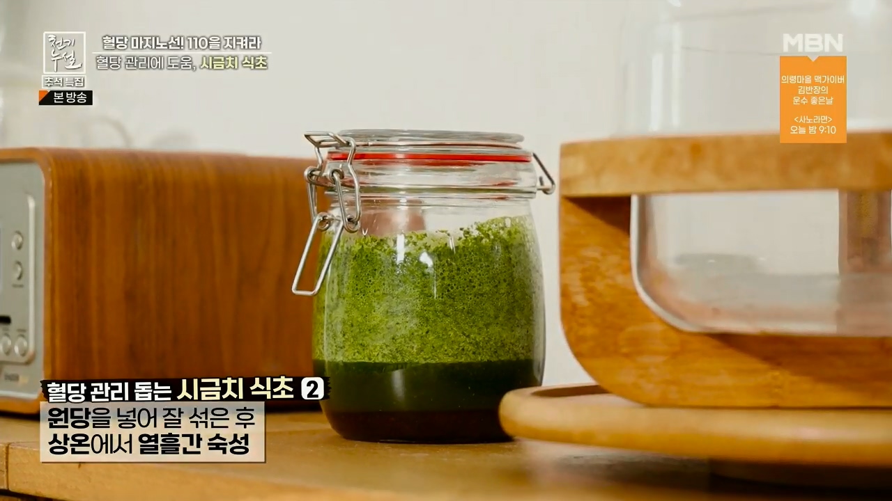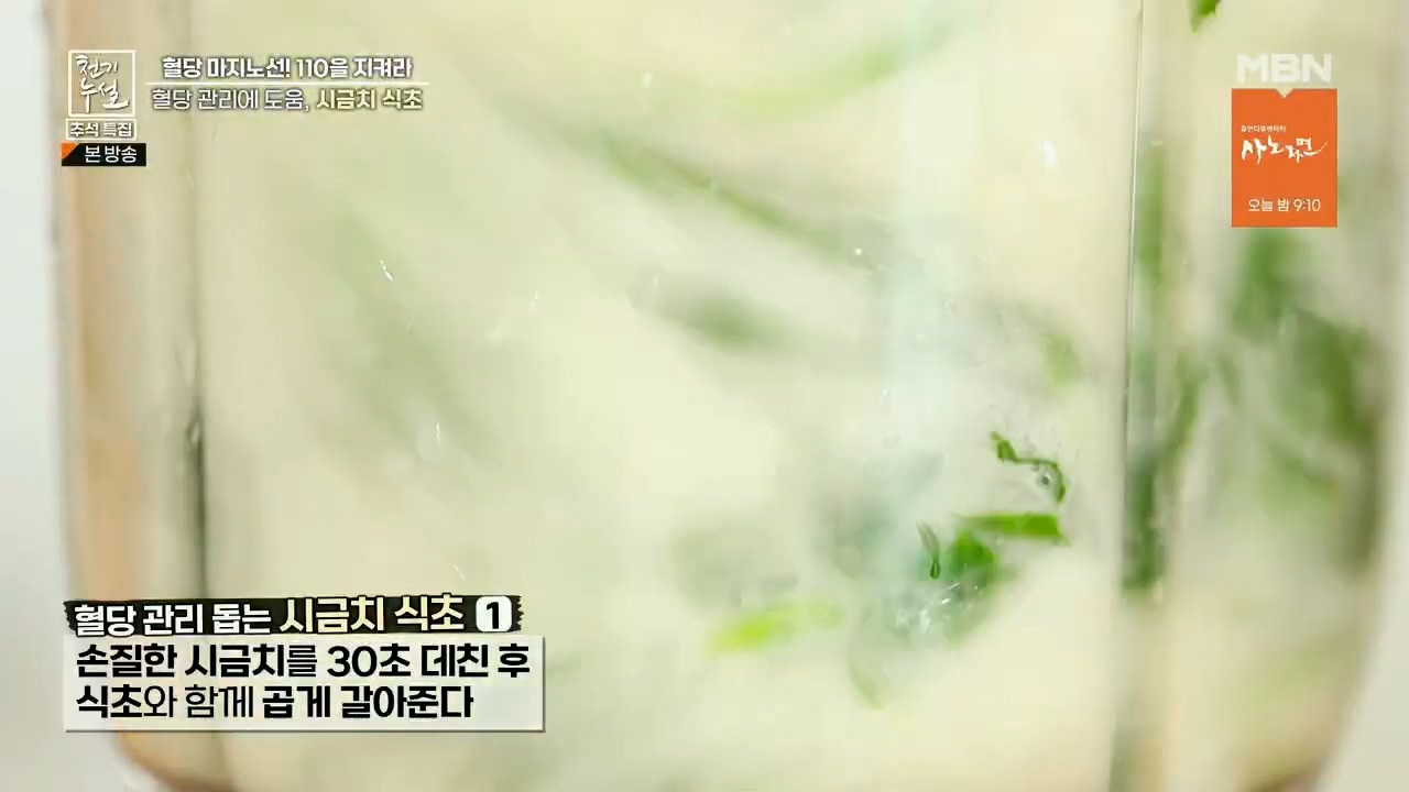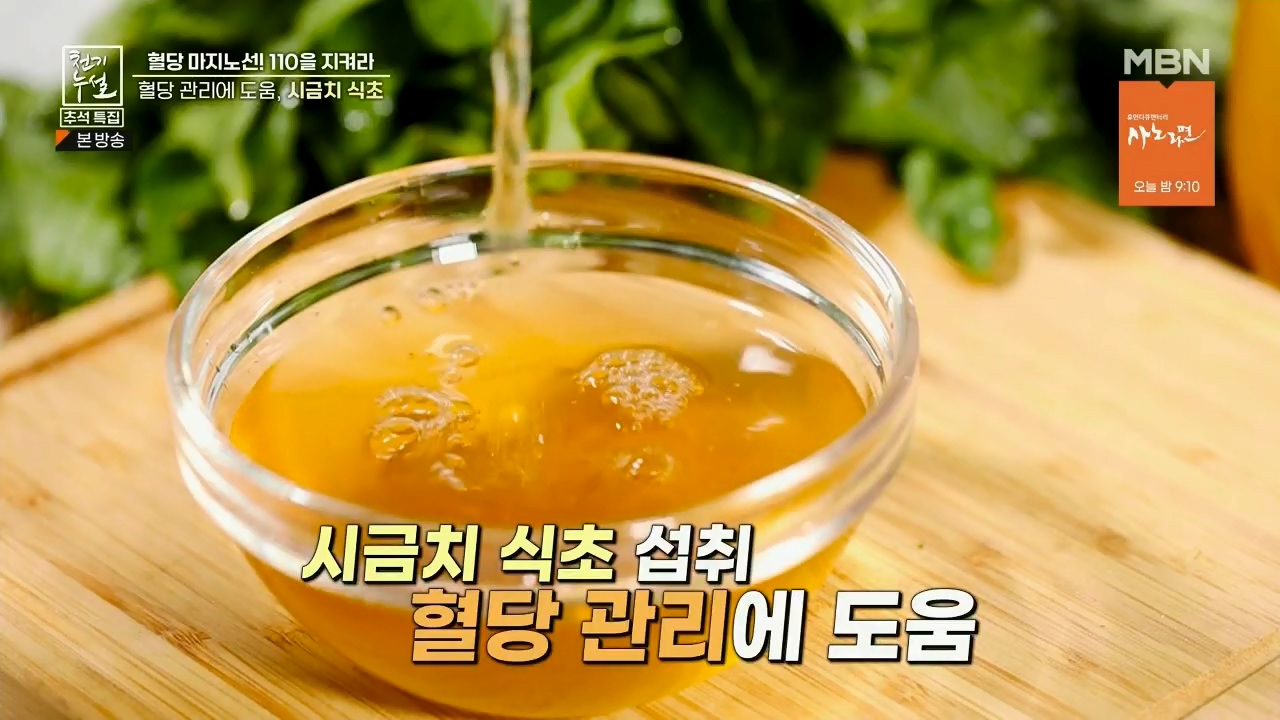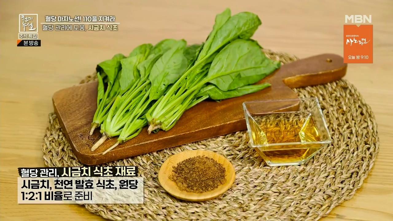 시금치에는 혈당 조절에 도움이 되는 알파리포산과 마그네슘, 틸라코이드가 들어있어서 혈당을 낮추는데 도움을 줘 당뇨에 좋다고 합니다. 천기누설에서는 혈당 낮추는데 도움을 주는 시금치 먹는 방법으로 시금치식초 만드는법을 알려줬는데요. 시금치식초 만들어서 비빔국수 같은 식초가 들어가는 요리에 활용하셔서 혈당 조절에 도움이 되었으면 좋겠습니다.