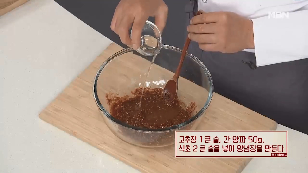 8. 고추장 1큰술, 간 양파 50g, 식초 2큰술을 넣어 양념장을 만듭니다.