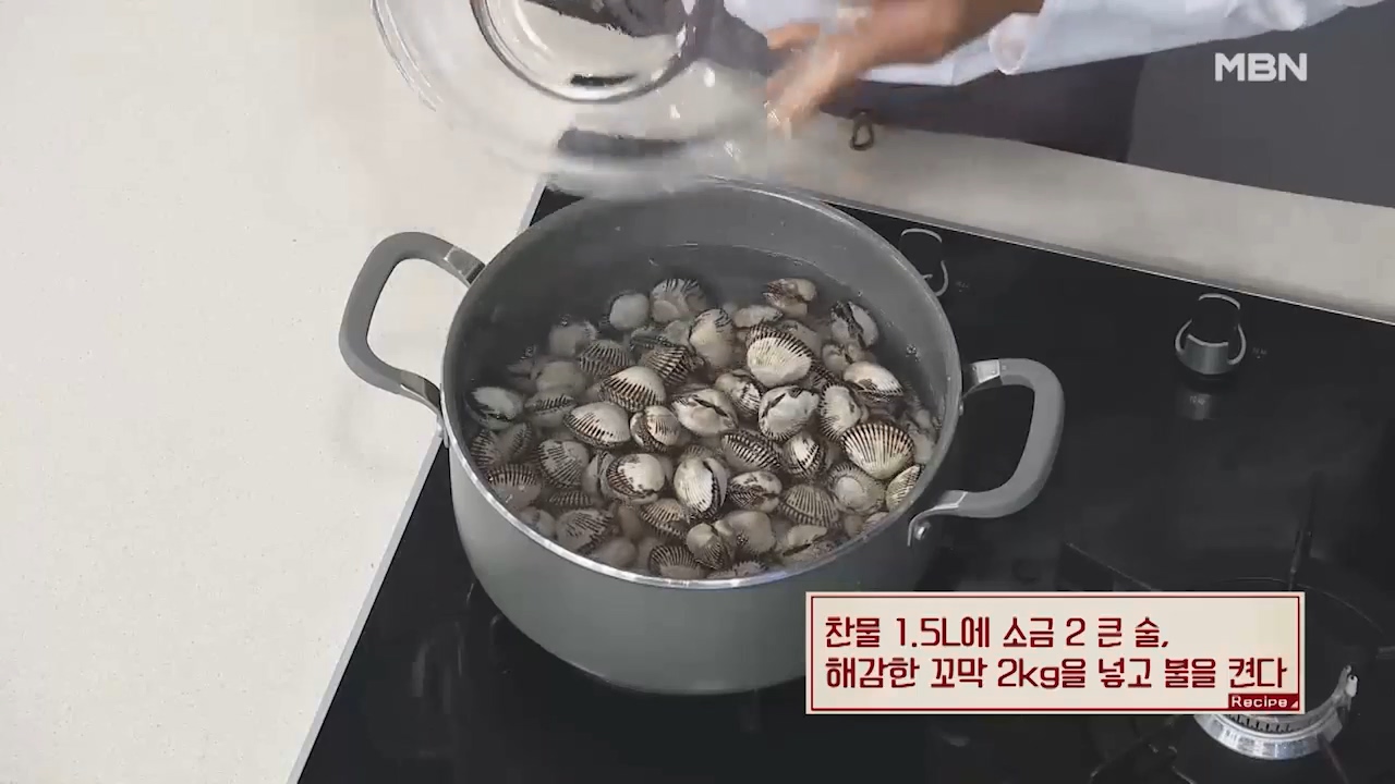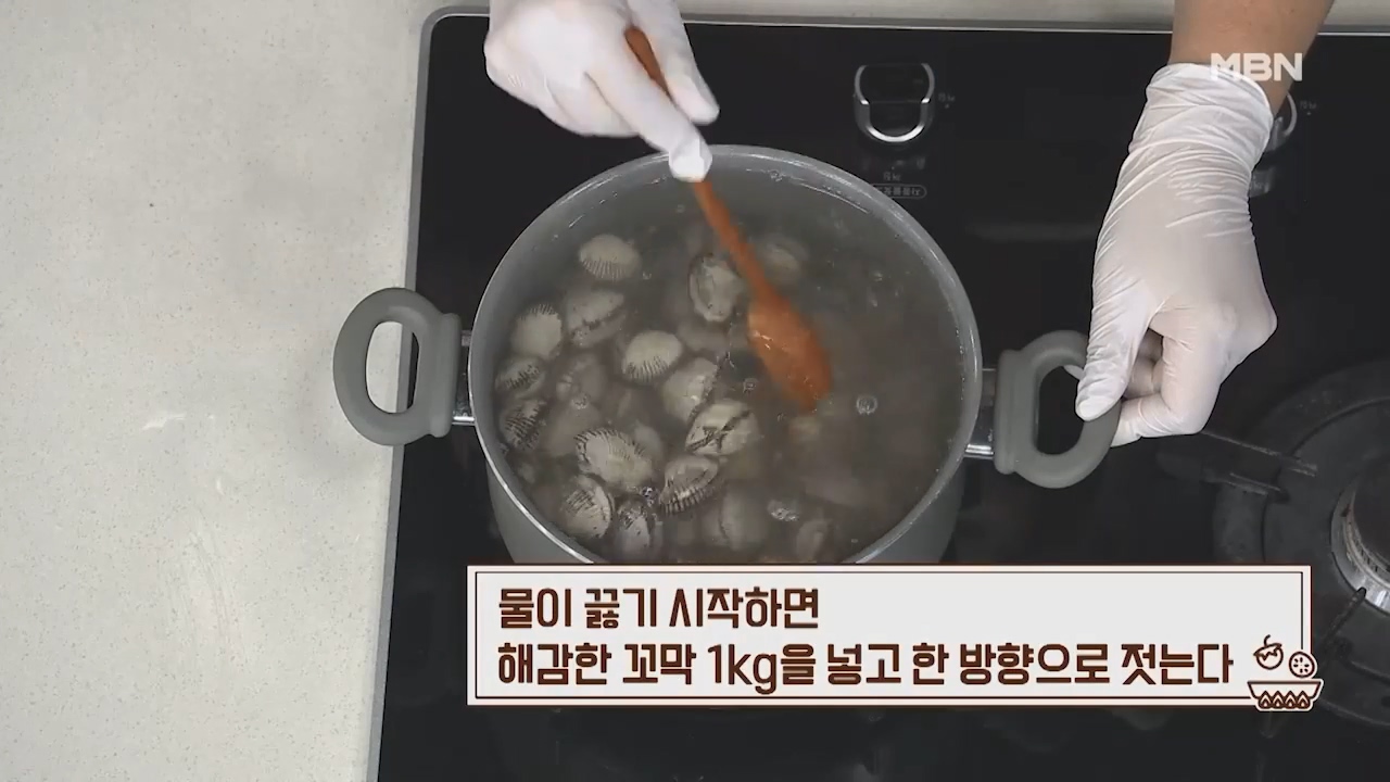 8. 물이 끓기 시작하면 해감한 꼬막 1kg을 넣고 한 방향으로 젓습니다.