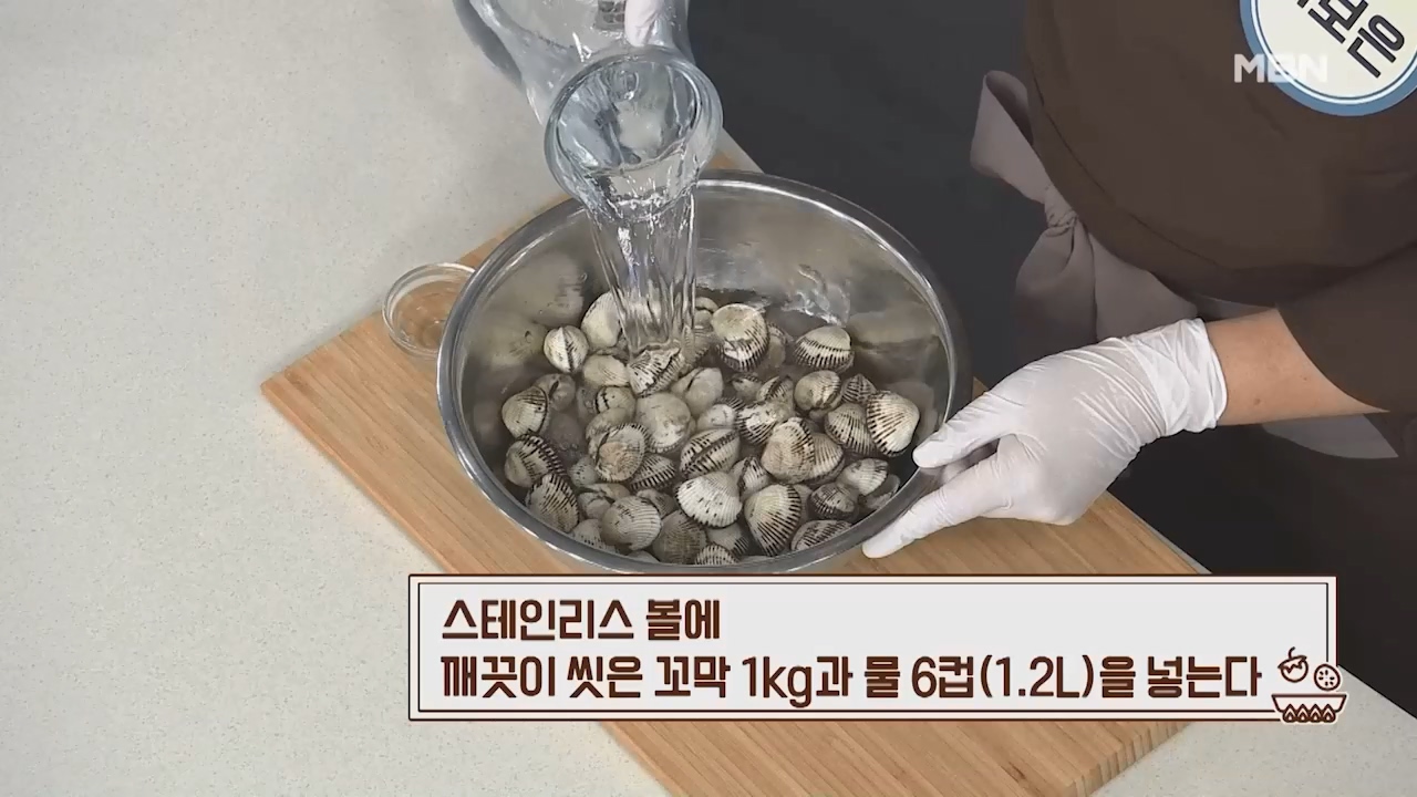 2. 스테인리스 볼에 깨끗이 씻은 꼬막 1kg과 물 6컵(1.2리터)을 넣습니다.