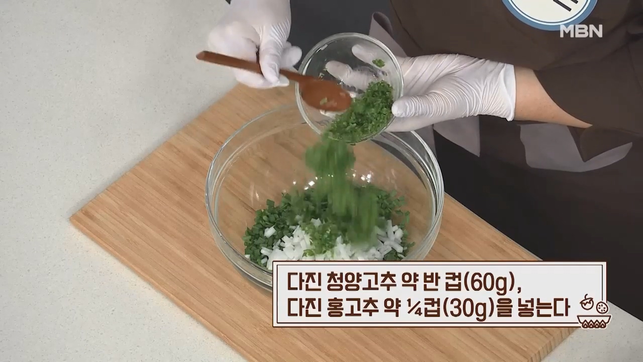 13. 다진 청양고추 약 반컵(60g), 다진 홍고추 약 1/4컵(30g)을 넣습니다.