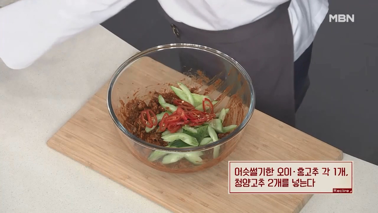 10. 어슷썰기한 오이와 홍고추 각 1개, 청양고추 2개를 넣어줍니다.