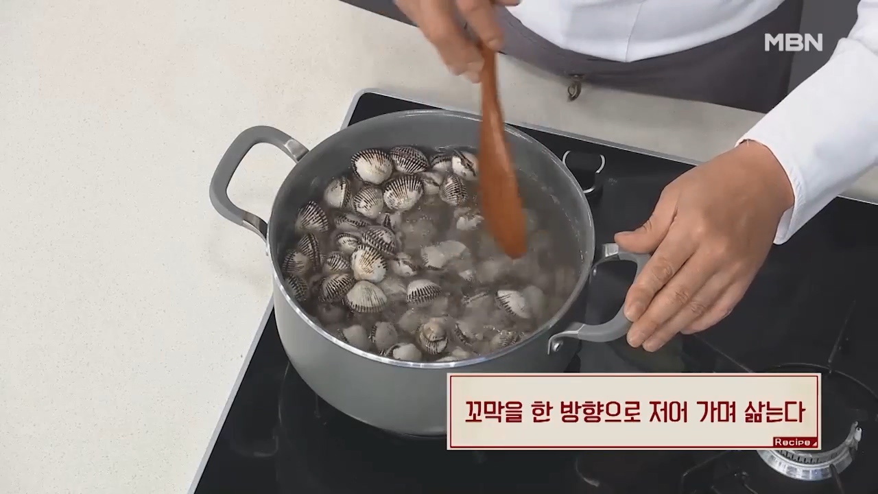 2. 꼬막을 한 방향으로 저어가며 삶아줍니다.