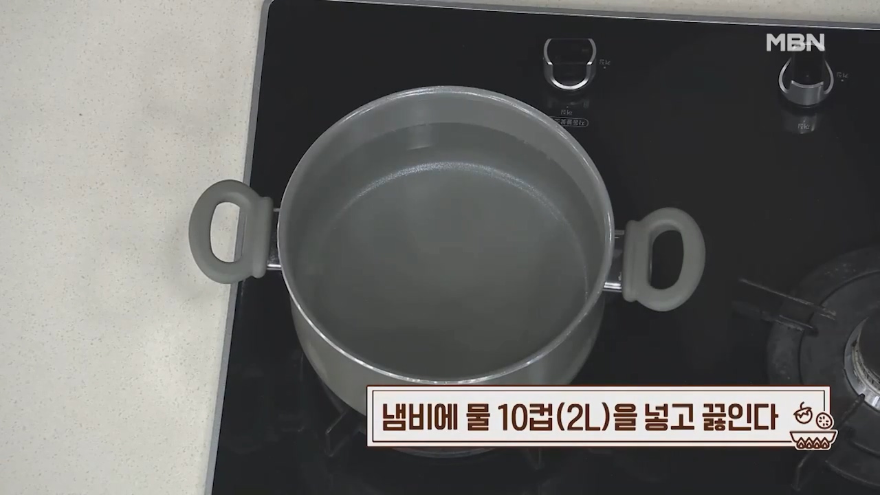 6. 냄비에 물 10컵 (2리터)을 넣고 끓입니다.